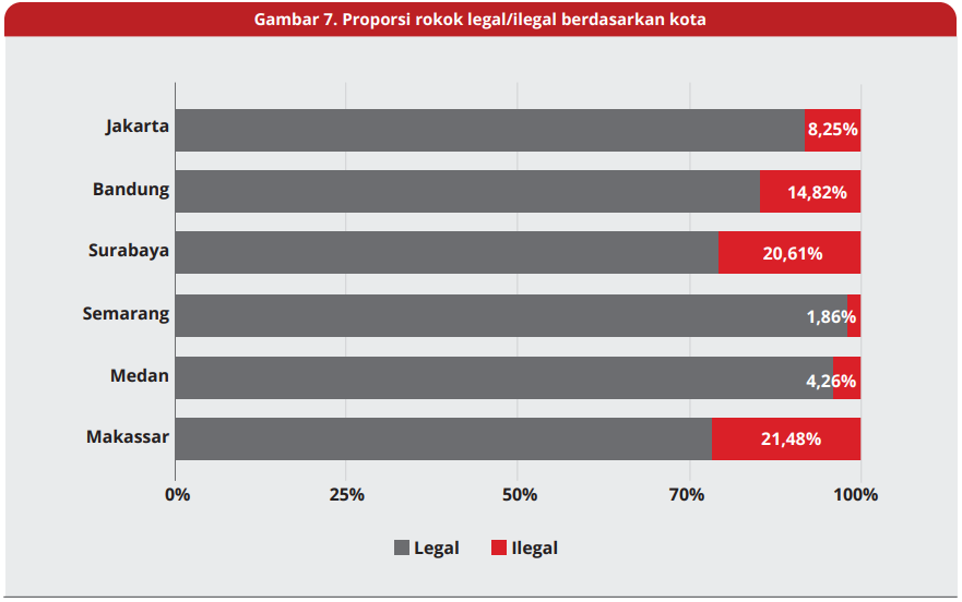 Hasil survei kemasan kosong oleh CISDI di enam kota besar pun memperlihatkan situasi serupa. Dari 8.173 kemasan rokok yang dikumpulkan, sebanyak 1.924 atau 19,2 persen dikategorikan ilegal—tidak memiliki pita cukai sah atau melanggar ketentuan kemasan. Makassar (31,5 persen) dan Surabaya (32,4 persen) mencatat angka tertinggi. Data ini menegaskan bahwa peredaran rokok ilegal tak lagi tersembunyi di “rumah belakang”, tetapi telah menembus pasar urban yang padat.